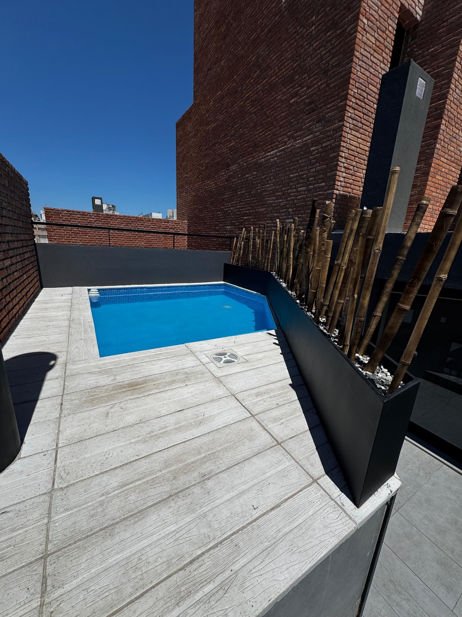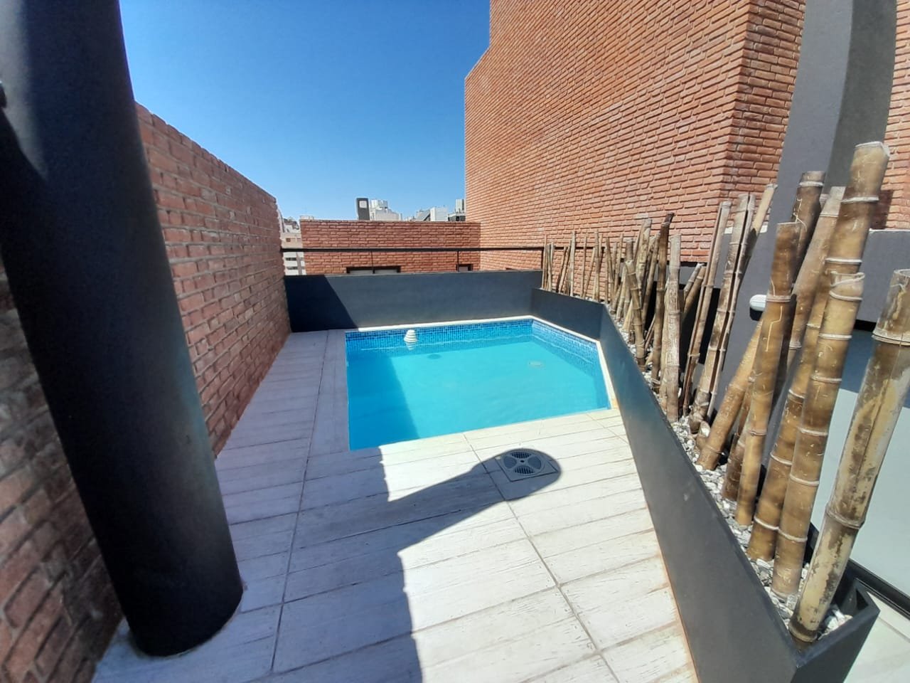 Terraza con piscina y solárium con vistas a la ciudad.